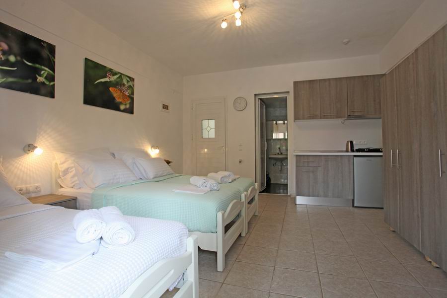 Tři pohodlná lůžka s pěnovými matracemi 80 cm šíře je možno doplnit o přistýlku, klimatizace s antibakteriální složkou s topným tělesem i pro možné vytápění v chladných měsících, samostatná koupelna s vanou a WC, elektrické zásuvky odpovídající koncovkám českých spotřebičů. Trezor. Lůžkoviny a ručníky jsou součástí krátkodobého pronájmu.