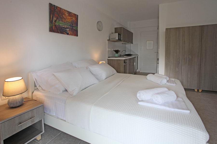 Tři pohodlná lůžka s pěnovými matracemi 80 cm šíře je možno doplnit o přistýlku, plochá TV, trezor, klimatizace s antibakteriální složkou s topným tělesem i pro možné vytápění v chladných měsících, samostatná koupelna s vanou a WC, elektrické zásuvky odpovídající koncovkám českých spotřebičů. Lůžkoviny a ručníky jsou součástí krátkodobého pronájmu.